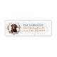 Le côté gauche de ces étiquettes d'adresse de retour présente l'image d'une couronne de fleurs de printemps aux couleurs rose, bleu, or, vert et crème. Au centre se trouve le portrait d'un chien de récupération du labrador au chocolat. De minuscules confettis d'or donnent un éclat subtil à l'arrière - plan. Votre texte personnalisé est en or bleu et brun à droite.