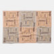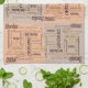 A unique kitchen towel design sports alternating beige and peach blocks with right side up and upside down text blocks of the words chocolate, dark chocolate, almonds in English, German and French plus other words in a variety of font styles, sizes and colours.