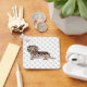 Destei's original cartoon illustration of a cute long hair chocolate brown and tan dapple coat colour Dachshund breed dog. There is also a personalizable text area for a name on the other side. The background has a pattern of grey dog paw prints.