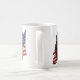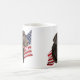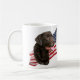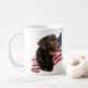 Chocolate Labrador Retriever head in front of a waving American flag on a mug.