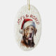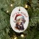 On the front of this Holiday ornament is a beautiful image of a chocolate brown Labrador Retriever dog in a Santa Claus hat. Behind the image is a gold confetti sprinkle background. Red text says "Joy to the World". The back of the ornament has the same confetti background and text fields for you to personalize each ornament.