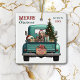 A teal blue retro pickup truck carries a decorated Holiday tree and gift packages on this cute ceramic Christmas ornament. Looking out from the tailgate is a chocolate brown Labrador Retriever dog wearing a red and white Santa Claus hat. A rustic wooden sign on the back bumper says "Christmas Cheer". The red and green stylized text at the top left says "MERRY CHRISTMAS", with your name (or your dog's) and the year at the right. Both sides have the same image.