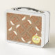 This is a standard metal lunchbox that appears to work just fine. We designed this box ourselves with an uploaded photo and custom text on the front and back. It looks absolutely beautiful except the front of the lunchbox is not centered like it shows in the photo. The print borders don't align with the inset flat part of the box where the preview photo online showed it perfectly centered in there. The back looks nice and centered though.