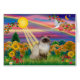 The autumn sun shines down on a Himalayan cat sitting against a background of colourful autumn foliage while a dove flies off and a bluebird sings on a branch full of brightly coloured leaves.