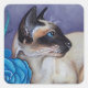 Original watercolor painting by Sandra Gale, featuring a chocolate point Siamese cat, surrounded by blue flowers on a pale purple background. Flowers are blue hydrangea, and blue poppies and a blue rose. Great design for cat lovers and those who especially like the Siamese breed. Perfect for bedroom wall art or framed with matching image. Matching watercolor painting of a blue point Siamese also available in my EverIrisPrints store.