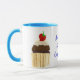 A white Ringer Mug with a powder blue rim and handle with a chocolate cupcake on each side, topped with a strawberry and cream. 'Anyone for a cupcake' is written between the two cupcakes in blue. The design is from a handpainted paper collage by Judy Adamson. You may also be interested to see other cupcake designs by Judy Adamson on greeting cards and T-shirts.