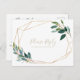 Cette carte de réponse de choix de menu eucalyptus chic géométrique doré est parfaite pour un mariage rustique. Le design présente un feuillage d'eucalyptus vert ornant un cadre géométrique doré.