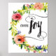 Typography design with beautiful elegant calligraphy with words, "Choose Joy." Typography is framed by cheerful watercolor floral wreath in background (forming a half circle on left of design).