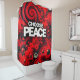 This shower curtain says "Choose Peace" on it.