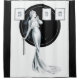This is an elegant and glamourous art deco illustration of a young blonde woman (that appears to be Betty Davis), in two piece white silk evening dress  that flow all the way to the floor trailing her feet by about a yard.