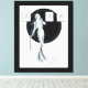 This is an elegant and glamourous art deco illustration of a young blonde woman (that appears to be Betty Davis), in two piece white silk evening dress that flow all the way to the floor trailing her feet by about a yard.