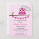 Une jolie invitation à la douche nuptiale avec un chouette hibou rose, tenant un parapluie et se tenant sur une branche avec une guirlande à coeur rose.