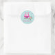 Autocollant personnalisé avec un petit hibou en caricature rose assis sur une branche avec des feuilles verts et des fleurs roses chaudes. Design amusant pour les enfants. Nom personnalisable Stickers spécial pour les cadeaux et les faveurs et toute occasion.