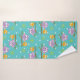 Cette adorable bande dessinée, chouettes sur branche, imprimé kit de serviettes de bain est parfait pour les amateurs de hibou ! Le motif mignon présente des chouettes violettes et jaunes sur une branche d'arbre avec un joli, turquoise bleu, arrière - plan. Image ©Prettygrafik.com