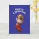 A Chow Chow wearing a Santa hat is sticking out of a Christmas stacking.