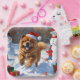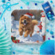 A fluffy Chow Chow runs joyfully through the snowy winter scene, wearing a festive red Christmas hat. This charming design highlights the breed’s thick coat, lion-like mane, and dignified personality while capturing the warmth and spirit of the holiday season. A heartwarming winter moment full of festive charm.