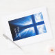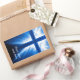 Christ crucifix silhouette on blue background with light rays from the back. Christianity, religion, easter symbol of resurrection.