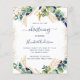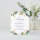 On the front: A white background decorated with eucalyptus greenery and golden leaves and faux gold glitter sparkles. A golden cross. Personalize and the child's name and ceremony details.