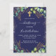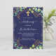 A navy blue background decorated with eucalyptus greenery and golden leaves and faux gold glitter sparkles. A golden cross. Personalize and the child's name and ceremony details.