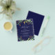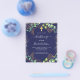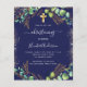 A navy blue background decorated with eucalyptus greenery and golden leaves and faux gold glitter sparkles. A golden cross. Personalize and the child's name and ceremony details.