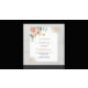 A white background decorated with eucalyptus greenery, a rose gold and blush pink rose, and golden leaves and faux gold glitter drops. Personalize and the childs name and ceremony details. Black and golden coloured letters.