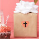A simple cross, a symbol of Christianity, on a patterned background in sunrise colours.