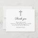 Christian, monochrome and traditional thank you card featuring black text with white background, artistic script fonts and a minimalist cross design. A photo of your loved one or a message can be added on the reverse side. To add click on the 'customize further' option after 'Personalize' and click on 'Background'.