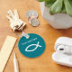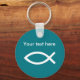 Here is a simple Christian keychain with the Ichthys fish symbol on a pretty bluish green background colour along with text you can personalize with your own message of faith, Christian saying, or church name.