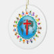 Cute illustration of a group of diverse little boys and girls holding hands around a globe of the world and a red cross representing faith in Christ. Easily customize and choose your own background colour. Image available on various gifts and products.