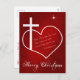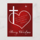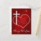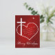 Images of white Christian cross, heart and a star high in the sky. The quote from the Bible: When they saw the star, they rejoiced with exceeding great joy. Matthew 2:10. White text Merry Christmas in the bottom. Dark red textured background. Customizable Cristian Christmas postcard for anyone. You can change or delete the template text on the background. Merry Christmas and Happy New Year. Happiness to You and Yours!