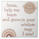 Monogrammed for you to insert your own prayer if you so choose, ceramic tiles. This cute boho theme planet and rainbow, with brown text on a white background, states, Jesus, help me learn and grow, in your wisdom may I sow!