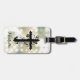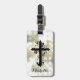 Custom luggage tag features a beautiful cross with a unique swirling design on a white lights background. Personalize with a first name on the front and your full name and address on the back.~