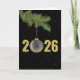 Gold 2025 Christmas ornament hanging from a pine tree bough on a black background with snowflakes.
