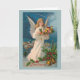 Designed by Susan Epps Oliver. Vintage image of a Christmas angel holding a wicker tray full of toys. There is a snowy landscape behind her and a starry sky. The message, decorated with holly and Christmas bells is " A Merry Christmas".