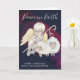 A christian themed christmas greeting card. Designed with a sweet angel with yellow wings holding a shepherds crook. Sitting with white fluffy lambs. Navy blue and burgundy watercolor background, with tiny flecks of faux gold sparkle glitter (not actual glitter just a printed image). Peace on Earth written in trendy script lettering. Personalize with your name and message.