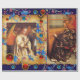 Oil painting by Flemish painter Jan van Eyck,The Ghent Altarpiece: Angels Playing Music and Annunciation Angel -1426-27 .Elegant,classic, bright and merry Christmas design on parchment with antique Florentine floral motifs and a shiny 3D blue sapphire and red ruby gemstones .
