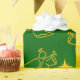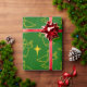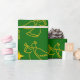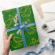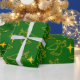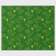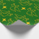 This wrapping paper has a Christmas design of angels and stars scattered about the design on a green background.