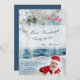 Our Christmas Baby Has Arrived card - A winter scene background with snow in the colours teal -green light blue and bright red Santa heads on a baby