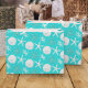 Beautiful coastal Christmas gift bag features a pattern of starfish, sand dollars, and glitter coral on an aqua blue background.