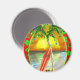 Happy Holidays from the warm sandy beaches of your favourite tropical island beach. Palm tree decorated with Christmas ornaments and lights, with a retro surfboard leaning against the Christmas tree in front a sunset over the ocean. Red and green holiday colour background of Hawaiian Honu sea turtles and hibiscus flowers.