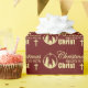 The feature on this faith themed wrapping paper is a simple silhouette nativity scene inside a circle with the Star of Bethlehem above, and the stylized text that says "Christmas Begins With Christ". At the end of the text is a simple gold cross. Everything is bright gold, and placed on a dark maroon red background.