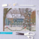 A Christmas blue barn in snow decorated with a wreath surrounded by trees and a large natural tree decorated with red Christmas bows.