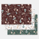 This Christmas gift wrapping paper features an elegant boho winter greenery pattern appearing in soft tans and teals. The wrapping sheets come in the set of 3, each with a different coloured background: white, dark burgundy, and dark teal green.