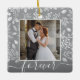 Your favorite photo on white leaves, berries and dots and ANY COLOR background (we show gray.) CHANGE the word FOREVER to anything! TIP: Put your text between the squares to retain the text swashes - upload a high resolution, photo cropped to square shape. This Christmas ornament makes a memorable gift for family and friends or create just for yourself - great party favors, too! Double-sided - add any info on the back.
