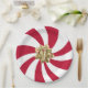 Gold gift bow on red and white Christmas peppermint candy swirl design.