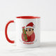 Christmas mug with an illustration of a cute smiling happy toddler boy, he is wearing red and white Santa Claus costume and holding a present; with editable text template for your name or message, Christmas holidays design