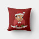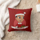 Throw pillow with an illustration of a cute smiling happy boy, he is wearing red and white Santa Claus costume and holding a present; with editable text template for your name or message, Christmas holidays design with a red background