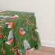 Festive table linens that make winter months more fun. The pattern features red bullfinch birds with pine cones and evergreen branches on white background.