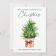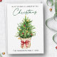 Modern Elegant Calligraphy Ink Script Have Yourself a Merry Little Christmas Card includes a Watercolor Pine Tree in a paper bag with a Red Ribbon Bow, Gold and Red Christmas Ornaments.