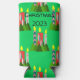 This seltzer can cooler has a Christmas design of candles made of rectangles decorated with stars, ovals, or diamonds with trees grouped around the bottom.